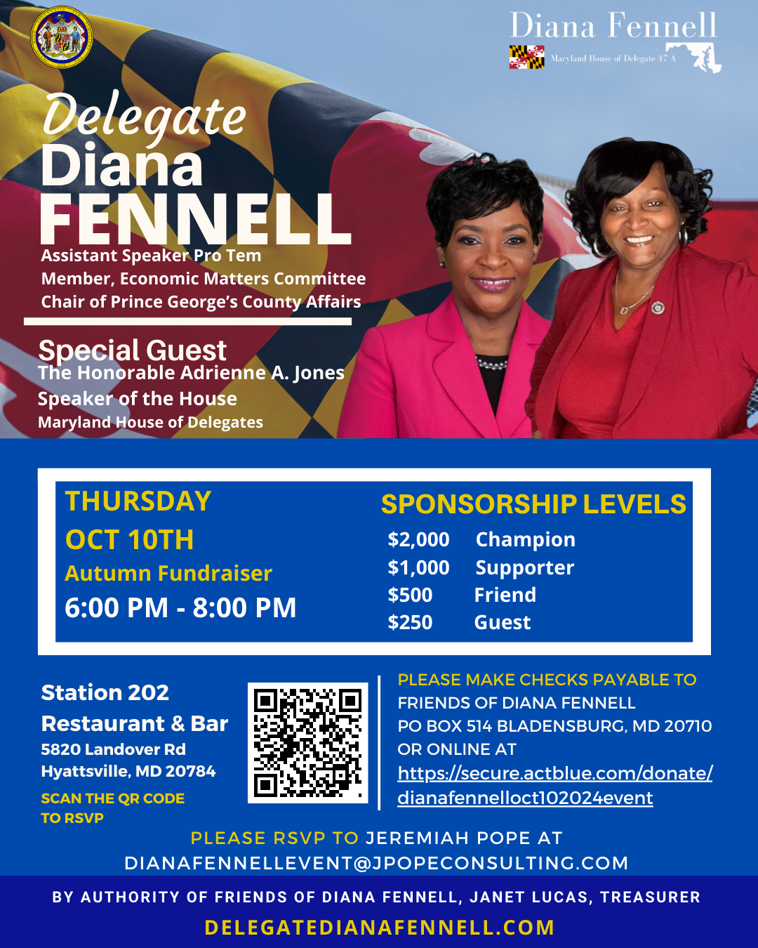 Please join Delegate Diana Fennell, Assistant Speaker Pro Tem and Chair of Prince George’s County Affairs, for an evening of community, conversation, and commitment to the future of District 47A. This Autumn Fundraiser is an opportunity to stand with Delegate Fennell as she continues her service in the Maryland House of Delegates, delivering on the priorities that matter most to our families and neighborhoods.