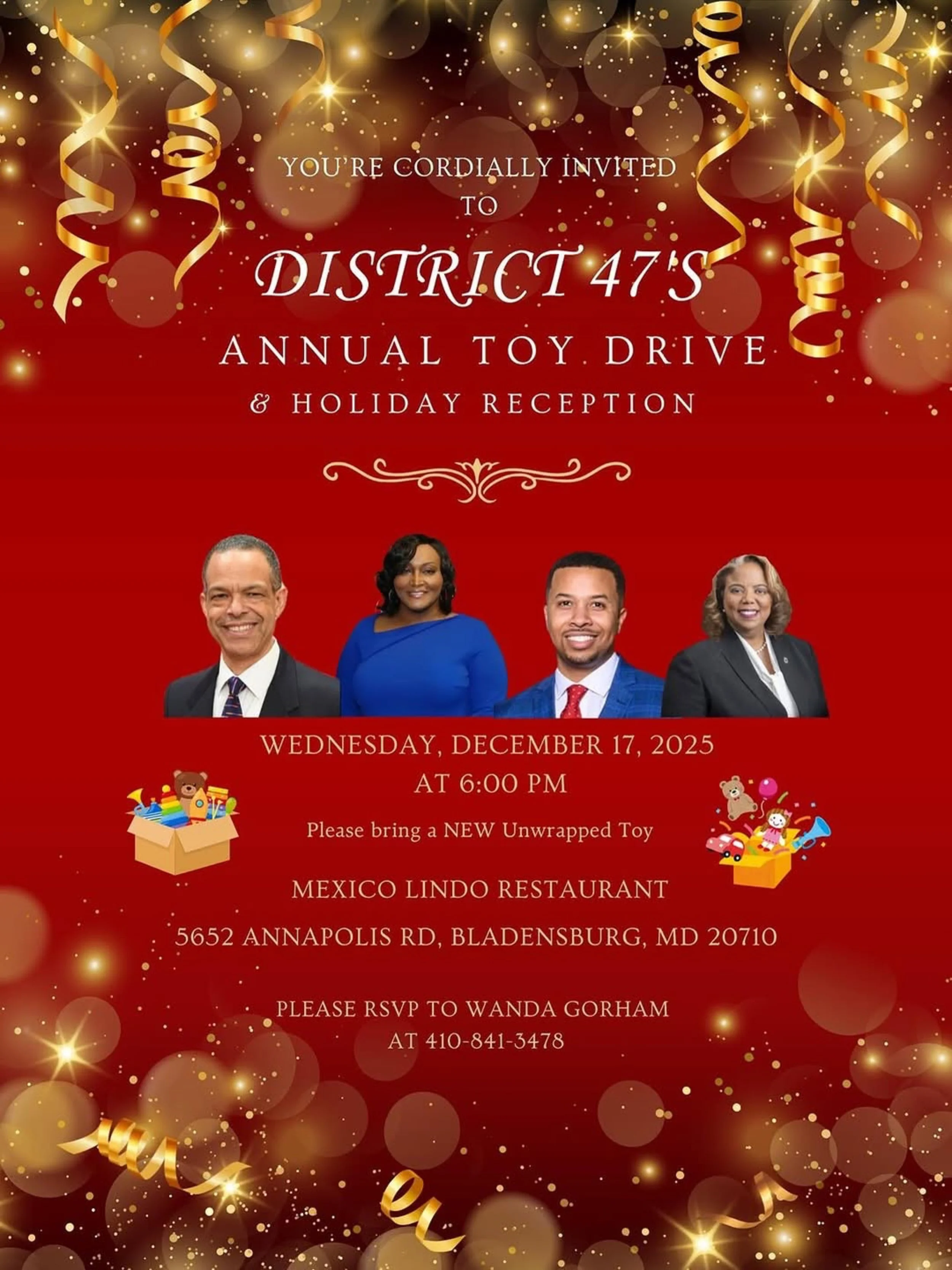 District 47 Holiday Party Wednesday, December 17, 2025 6:00 PM 9:00 PM Mexico Lindo (map) Google Calendar ICS